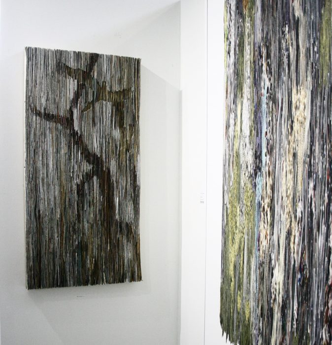 Ilan’s striking works do not fall into the conventional categories of painting or sculpture, but rather lie somewhere in-between. Her flickering landscapes consist of dense rows of paper which she folds and fastens via laborious, patient work. The continuous lines that run along the work combined with the changing hues of the paper scraps, elicit a sense of constant motion. The borders between image and background, between the real and its silhouette, dissolve, and the alternately enhanced and fading coloration emphasizes the sense of transience.